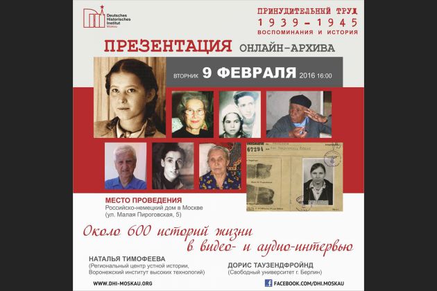 Региональный центр устной истории ВИВТ и Свободный университет ( г. Берлин, Германия) 9 февраля в Российско-немецком доме в Москве проведут презентацию онлайн-архива "Принудительный труд 1939-1945. Воспоминания и история".