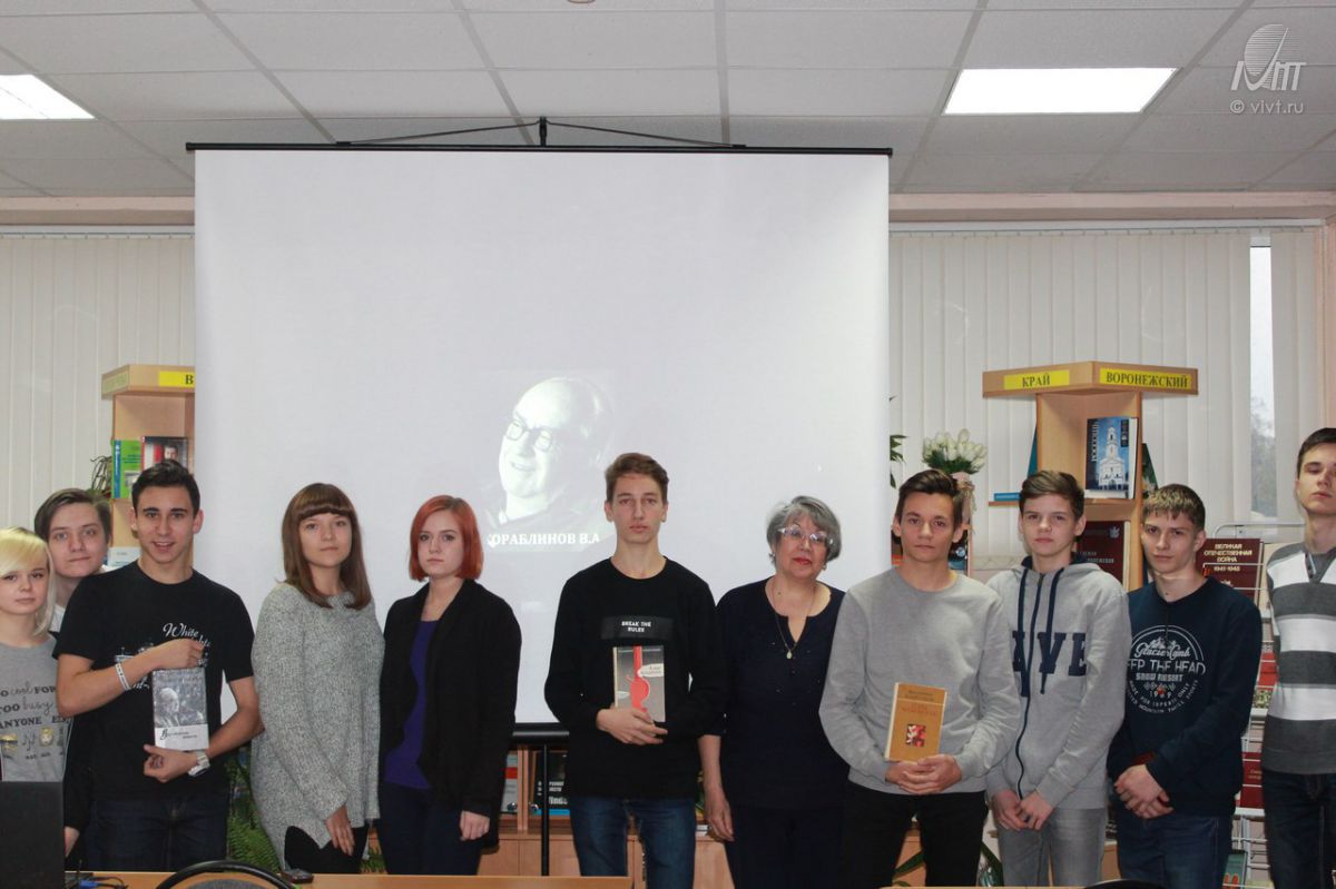 20 октября 2016 г. в Воронежском институте высоких технологий прошла беседа в читальном зале библиотеки ВИВТ со студентами первого курса по теме «Жизнь и творчество В.А. Кораблинова (1906-1989)», посвящённая 110-й годовщине со дня рождения писателя. Беседу провела Галина Викторовна Вишина, кандидат педагогических наук, доцент, ведущий научный сотрудник Воронежского областного литературного музея им. И.С. Никитина.